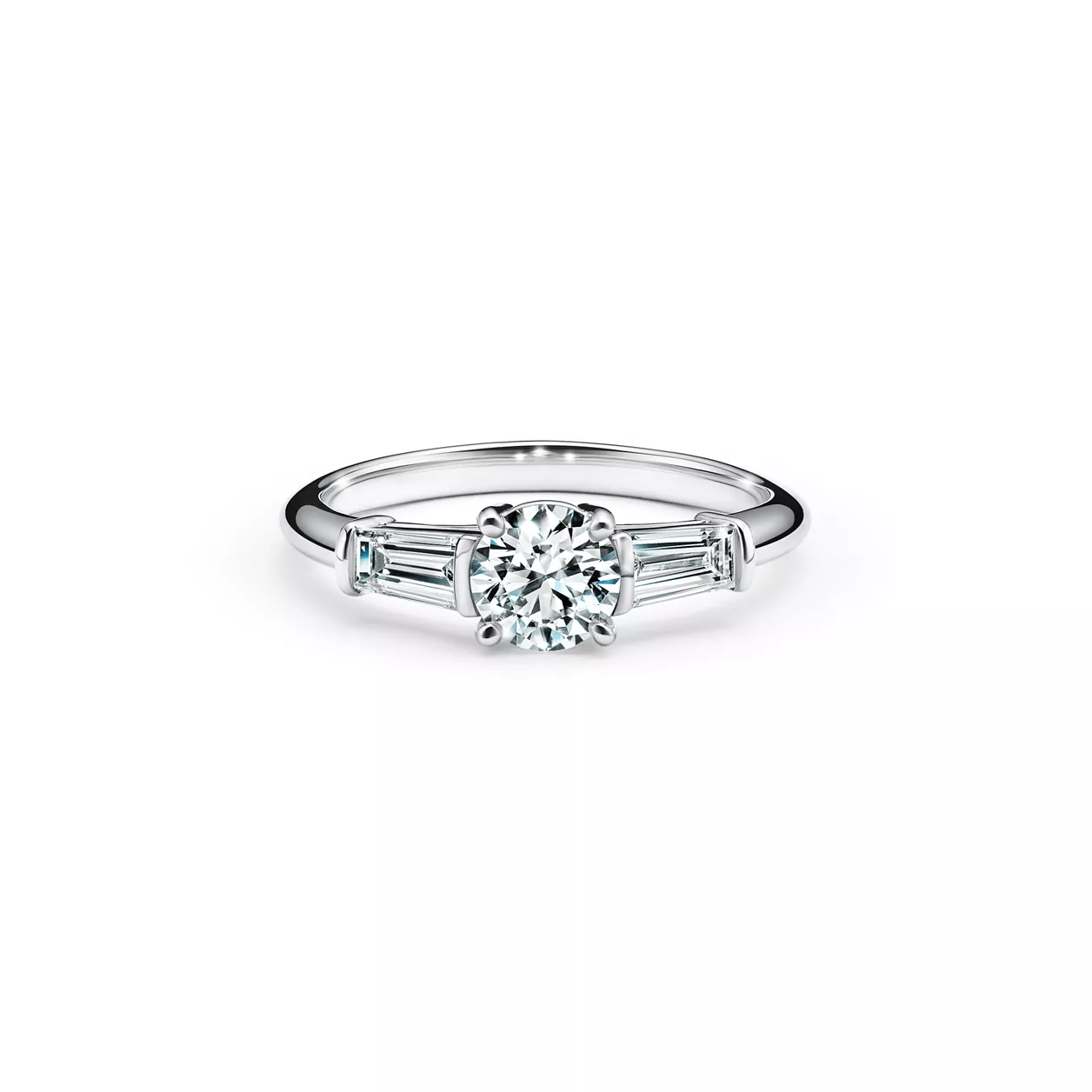 Featuring two tapered baguette diamonds precisely cut to frame a classic round brilliant center stone, this Tiffany Three Stone diamond engagement ring is a study in timeless beauty and extreme attention to detail. Handpicked by Tiffany craftspeople to maximize the vibrancy and light of the center stone, the two tapered baguette side stones have a color grade that is equal to or one less than that of the center diamond. At Tiffany, we ethically source our diamonds. Integrity and social responsibility are at the core of our sourcing practices.