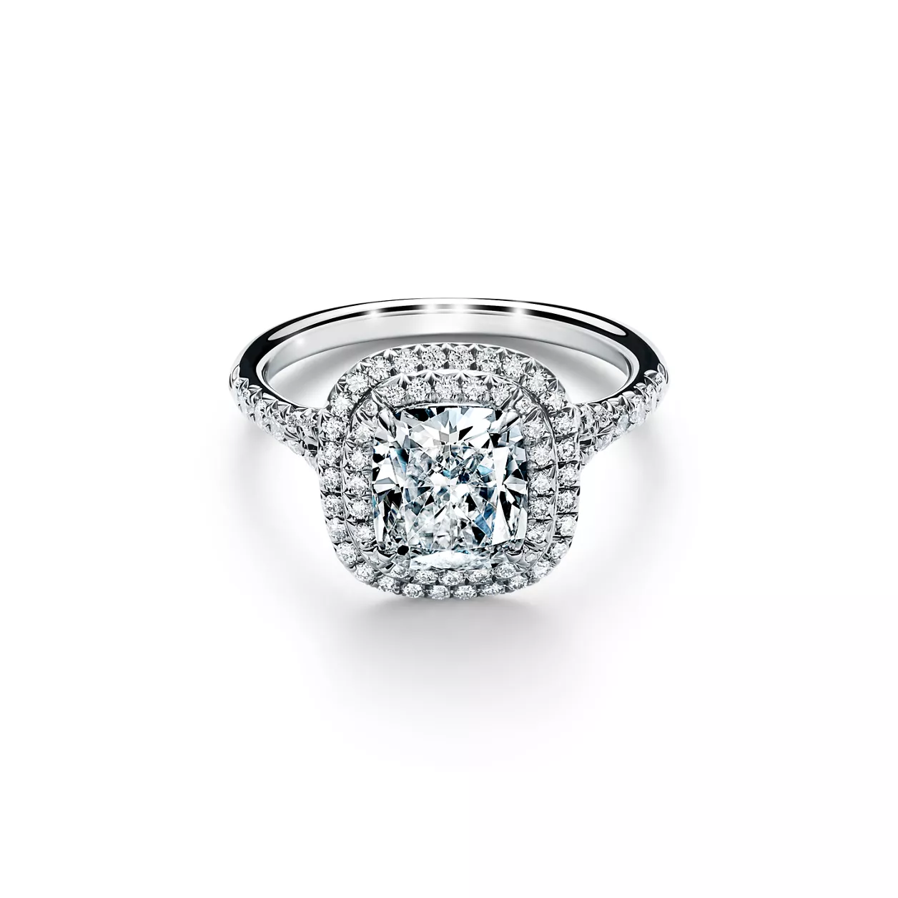 Just as the sun’s rays radiate outward, casting light in every direction, so too does the Tiffany Soleste® engagement ring. With a scintillating double halo of brilliant diamonds and a striking cushion-cut center stone, light is gathered and mirrored throughout the design, resulting in an unrivaled display of brilliance. At Tiffany, we ethically source our diamonds. Integrity and social responsibility are at the core of our sourcing practices.