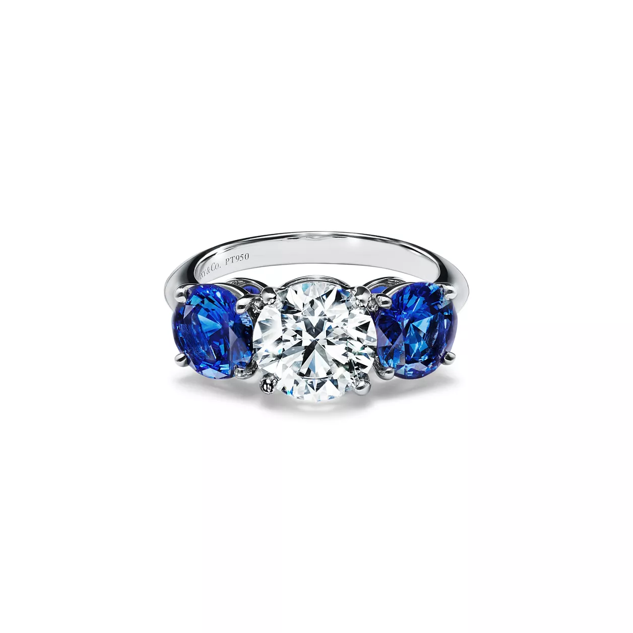 Featuring two rich round sapphires precisely cut to frame a classic round brilliant diamond center stone, this Tiffany Three Stone engagement ring is a study in timeless beauty and extreme attention to detail. The two velvety sapphire side stones complement the bright diamond center stone.