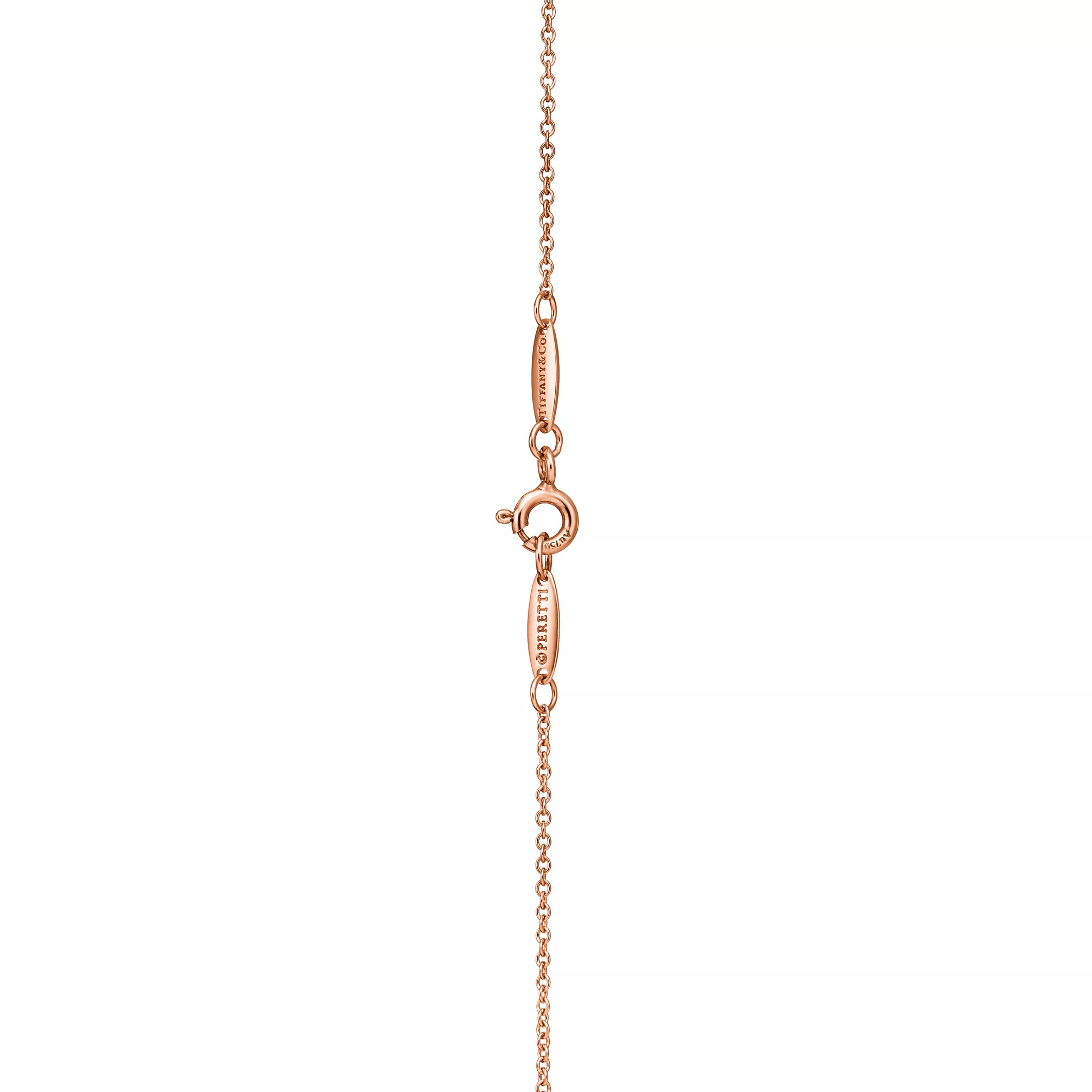 18k rose gold with round brilliant diamondsMotif size, 12 mm16" longCarat total weight .02Original designs copyrighted by the Nando and Elsa Peretti Foundation -