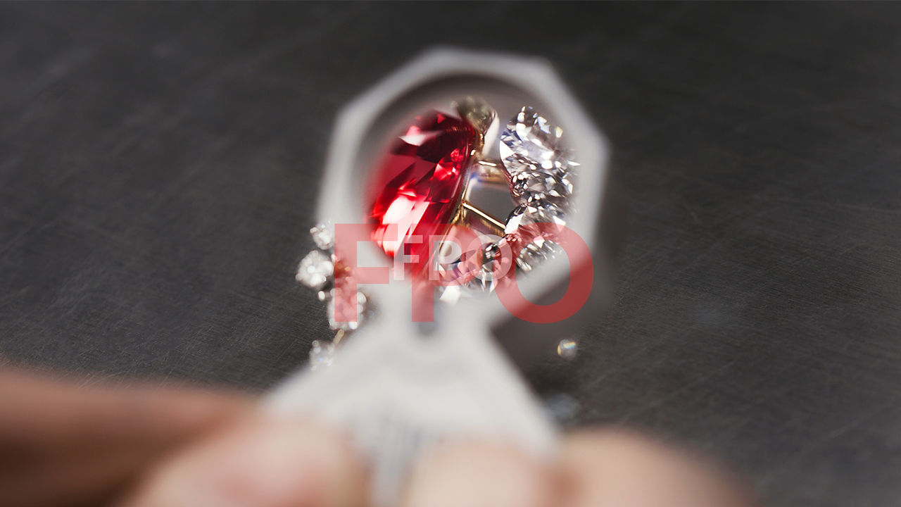 “A bespoke piece in the spring launch is the Ray of Light necklace, which transforms into a brooch. It features an outstanding suite of 17 pear-shaped and two triangle-cut red and pink spinels of over 53 total carats, each accentuated by diamonds that evoke rays of light emanating from the spinels.”
