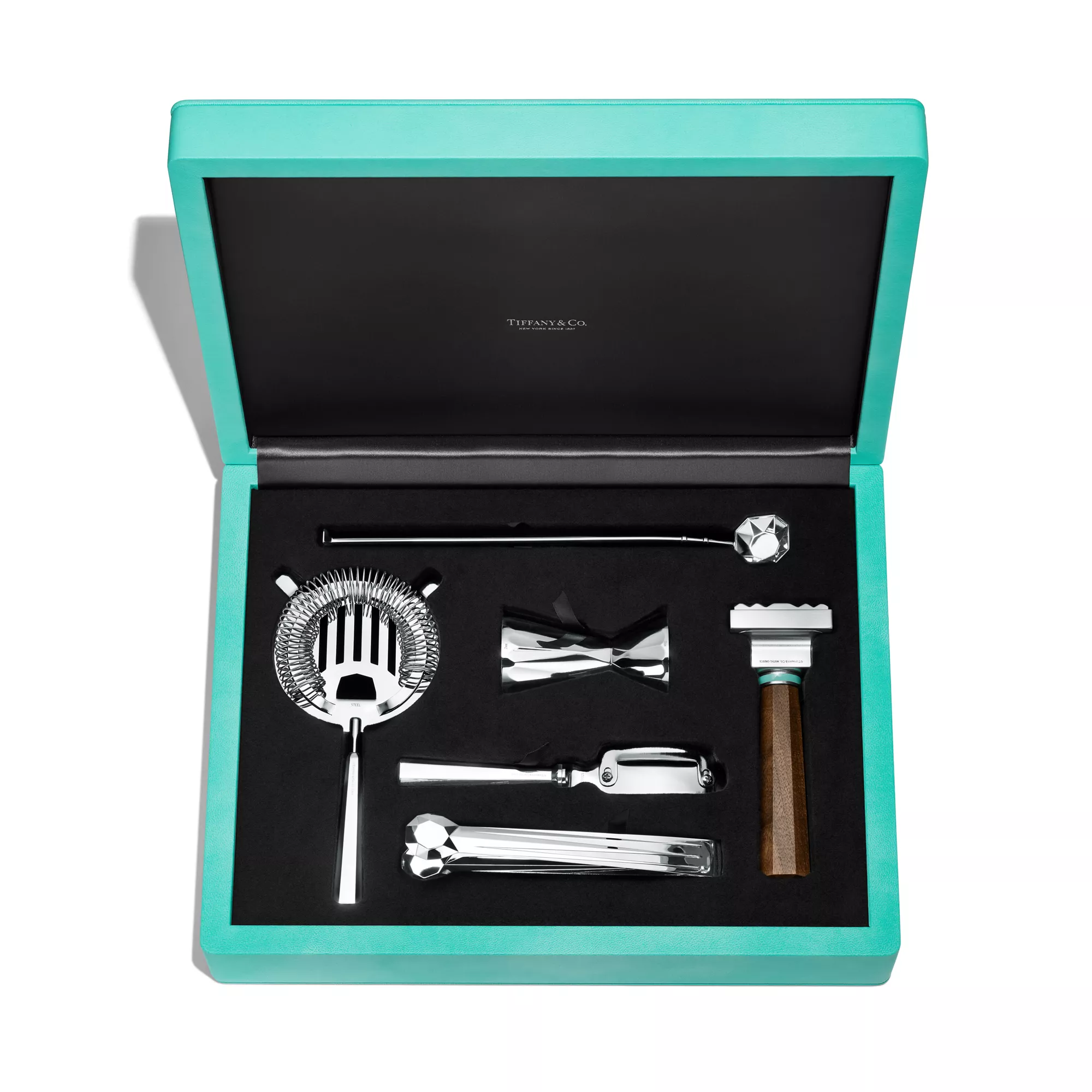 5. Tiffany Facets:Bar Tool Boxed Set in Wood and Brass with Silver Plate