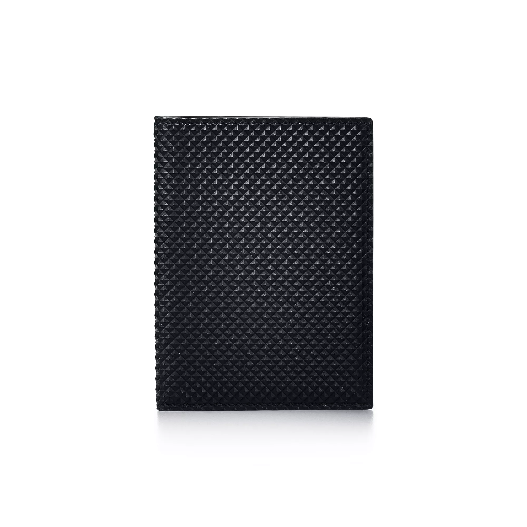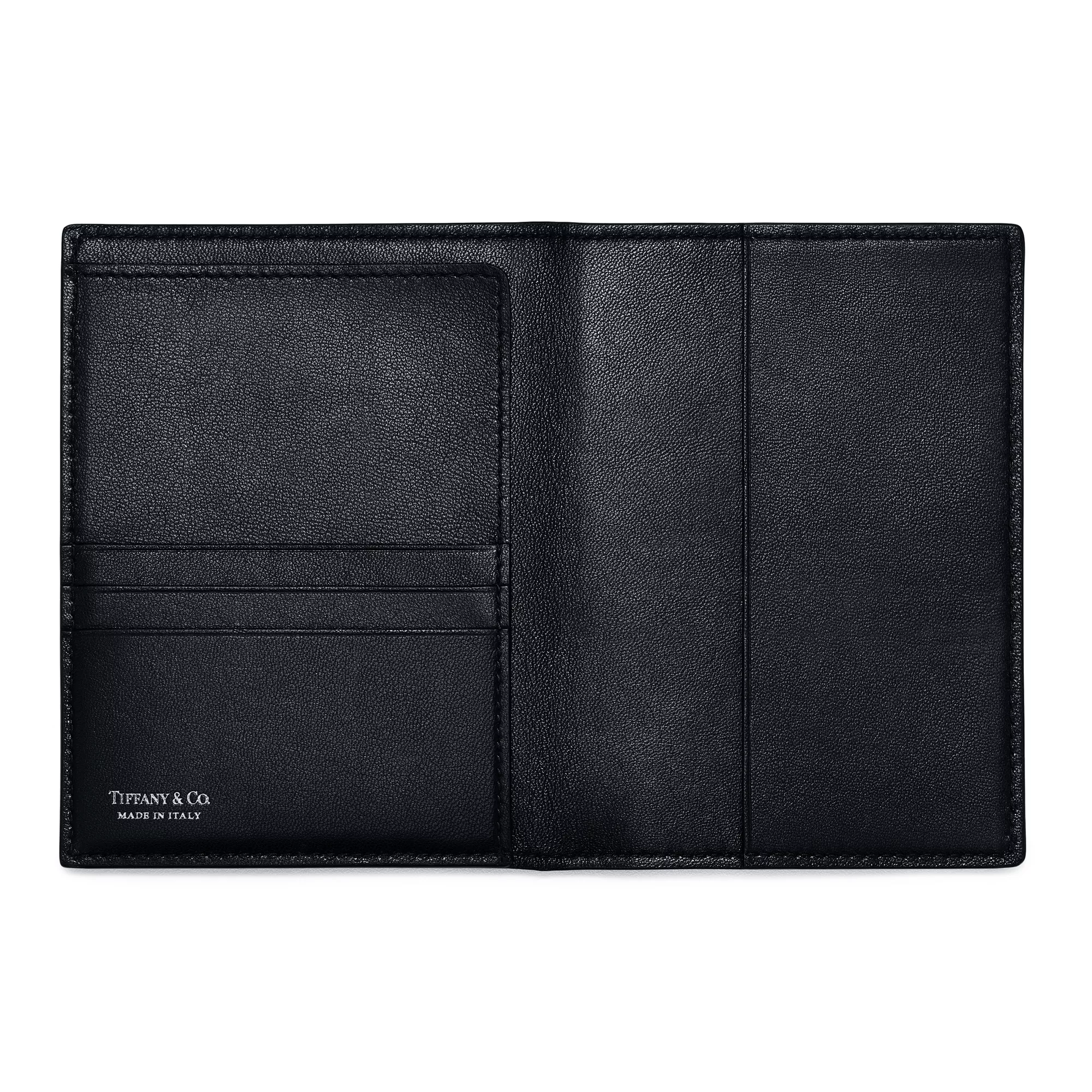 Black calfskin leather3.9 x 5.3"Three interior credit card slots, one open pocket and one passport pocketLeather-linedMade in Italy -