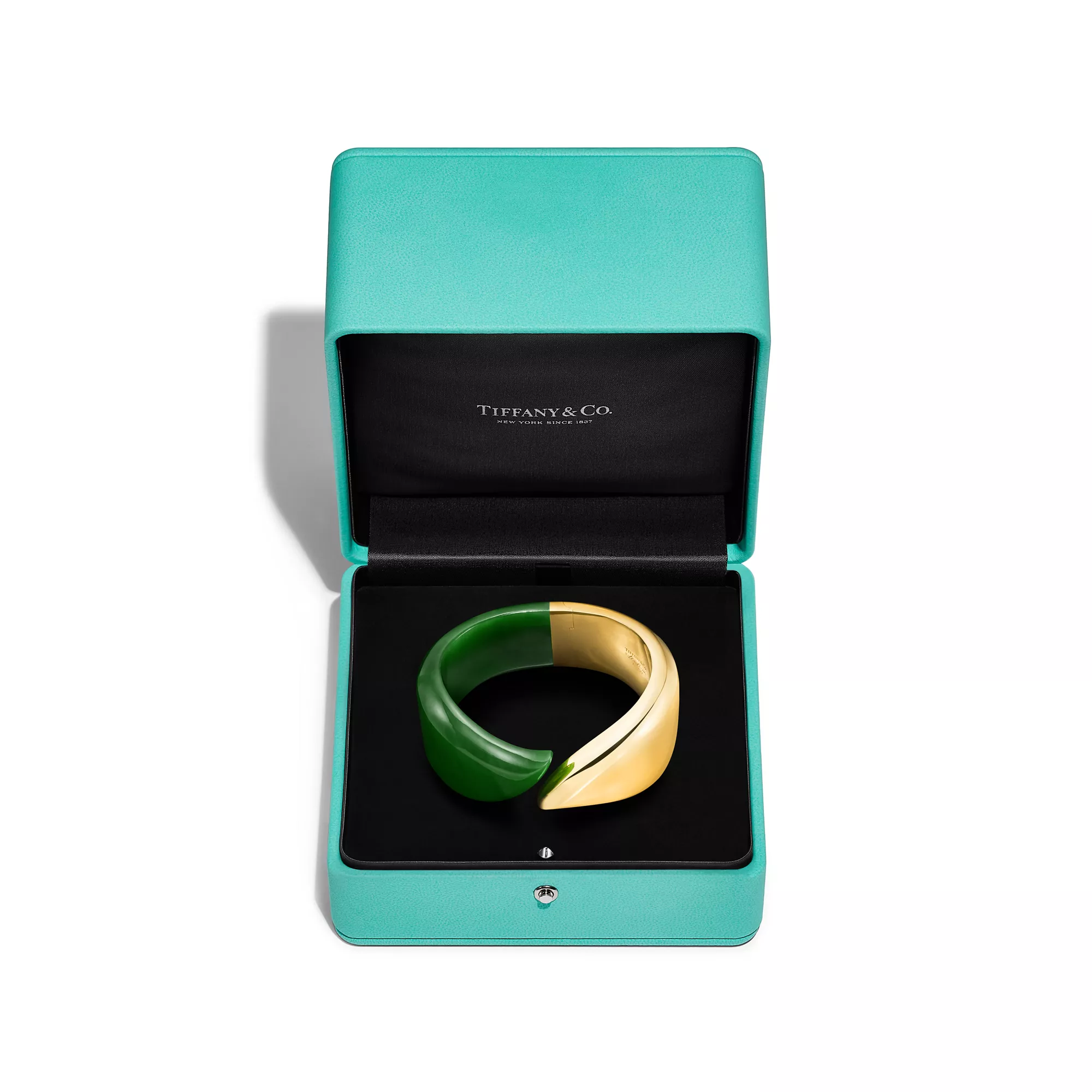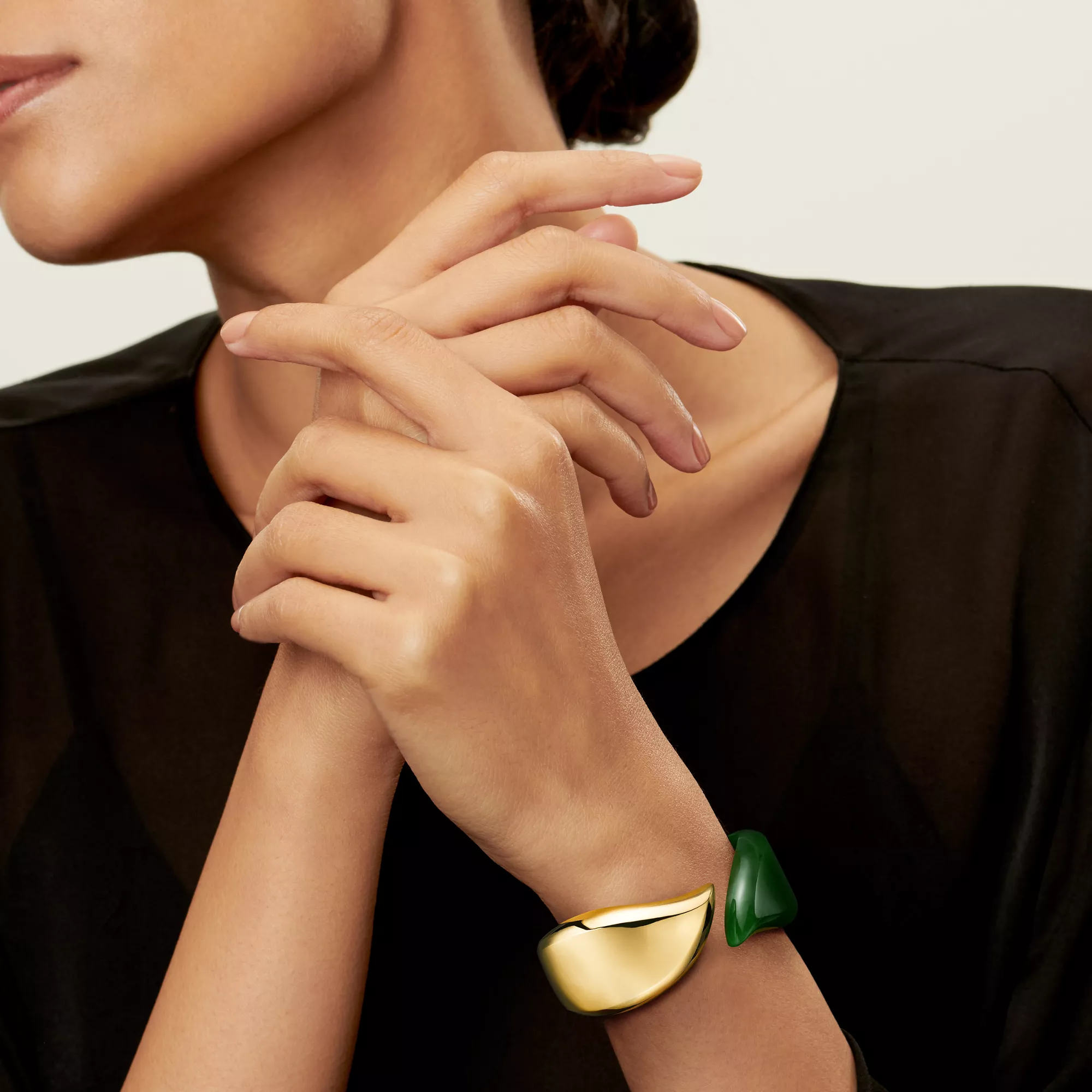 4. Elsa Peretti®:Feather Cuff in Yellow Gold with Green Nephrite Jade