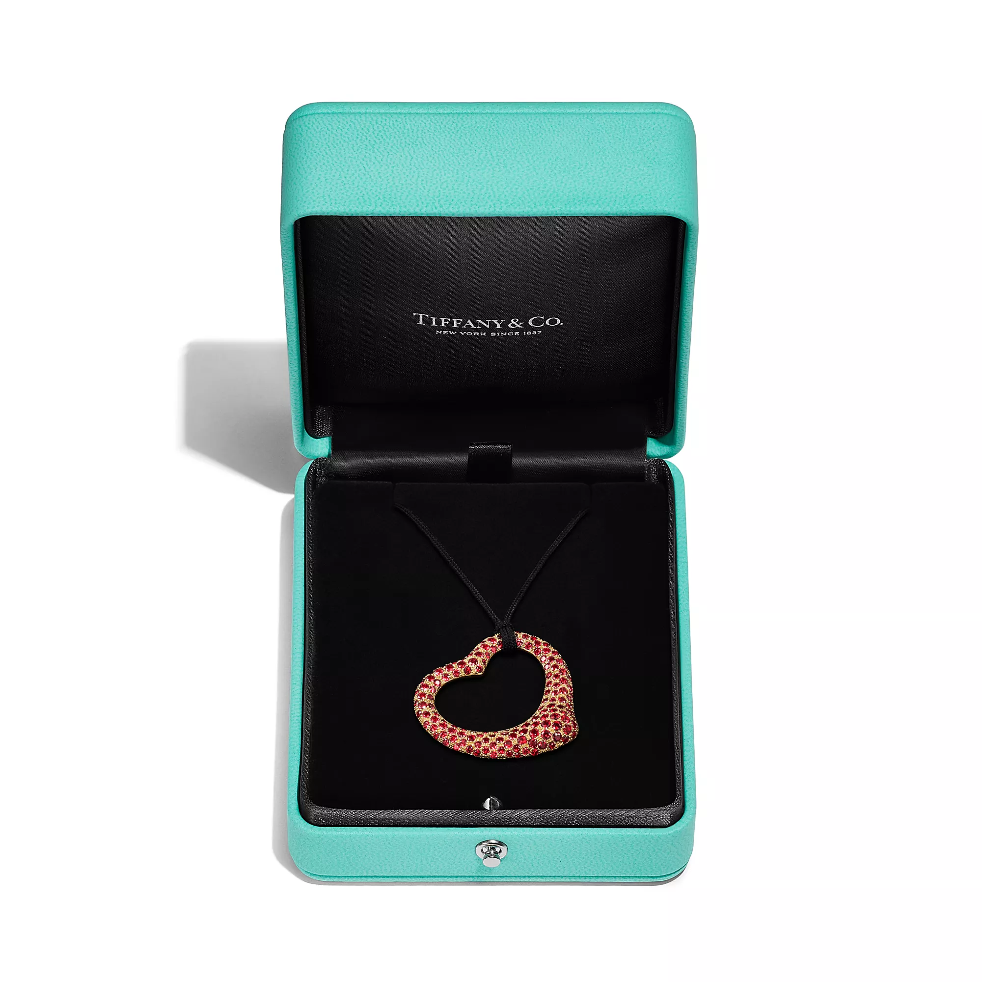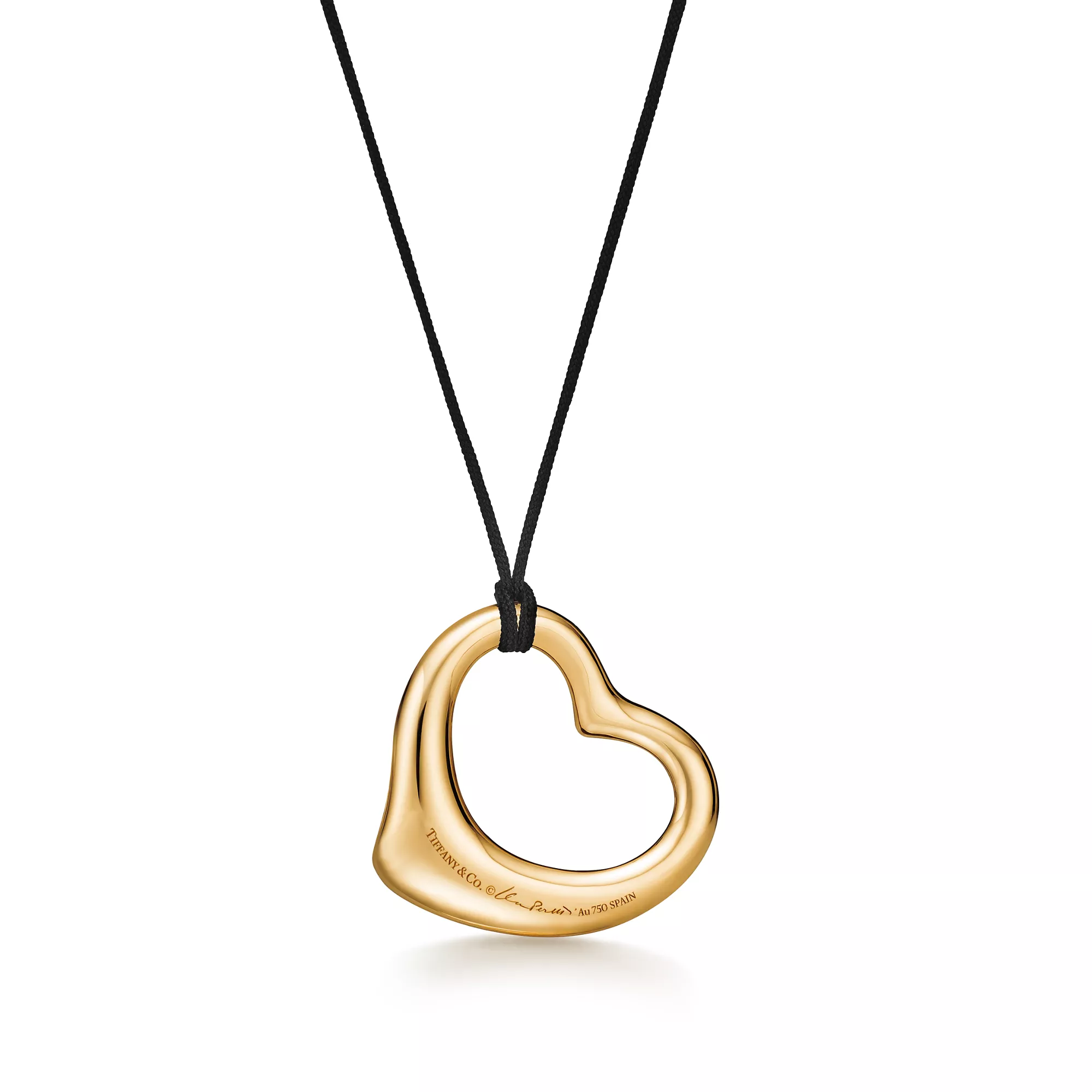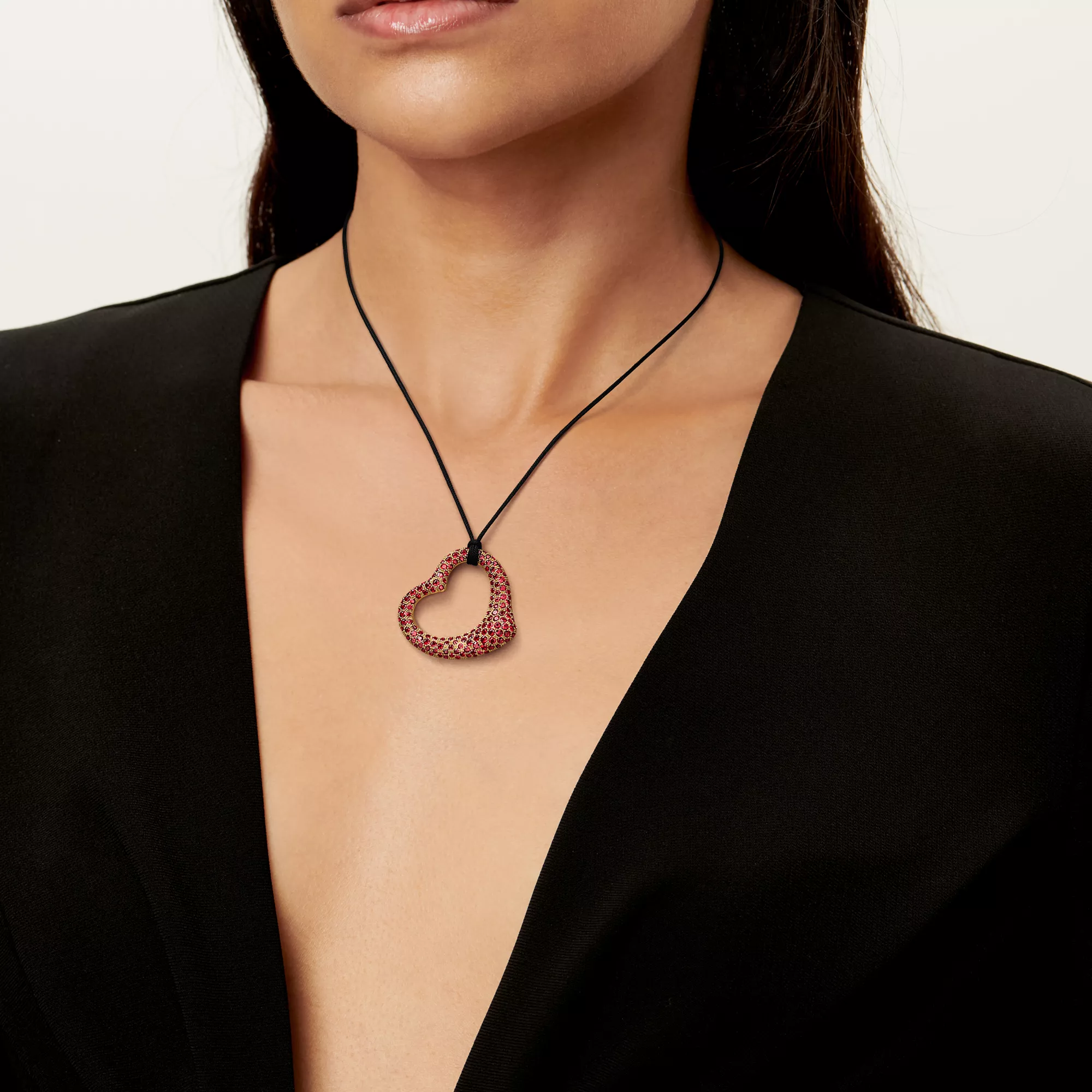 4. Elsa Peretti®:Open Heart Silk Pendant in Yellow Gold with Rubies and Black Silk