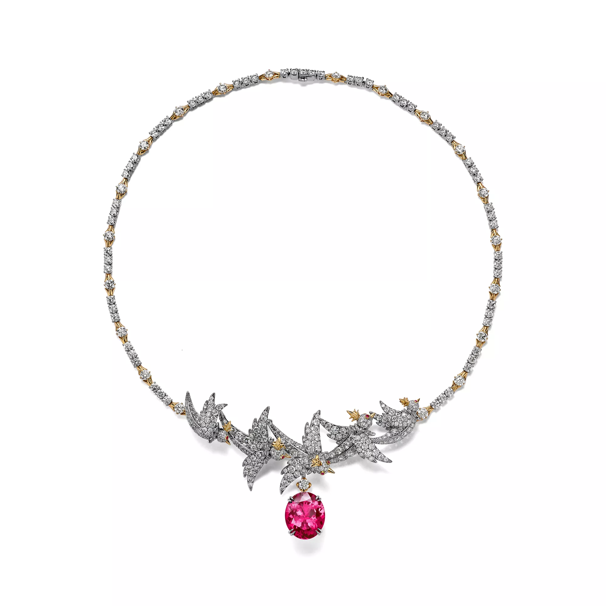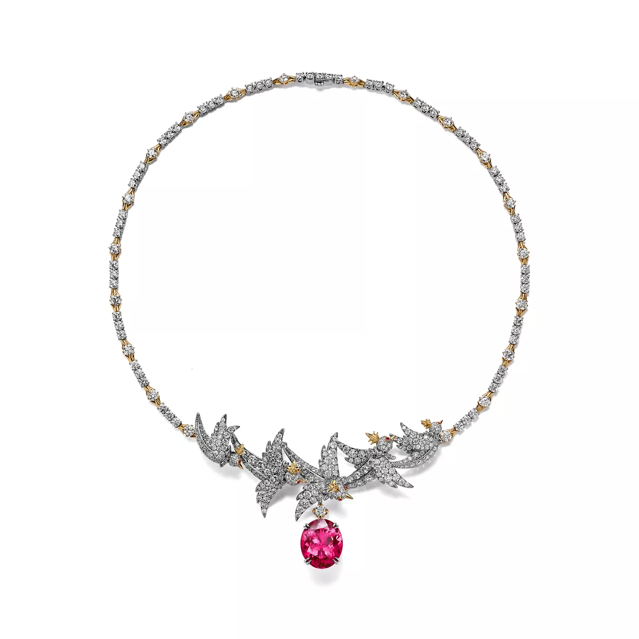 - Bird on a Rock by Tiffany:Necklace in Platinum and Yellow Gold with a Rubellite and Diamonds