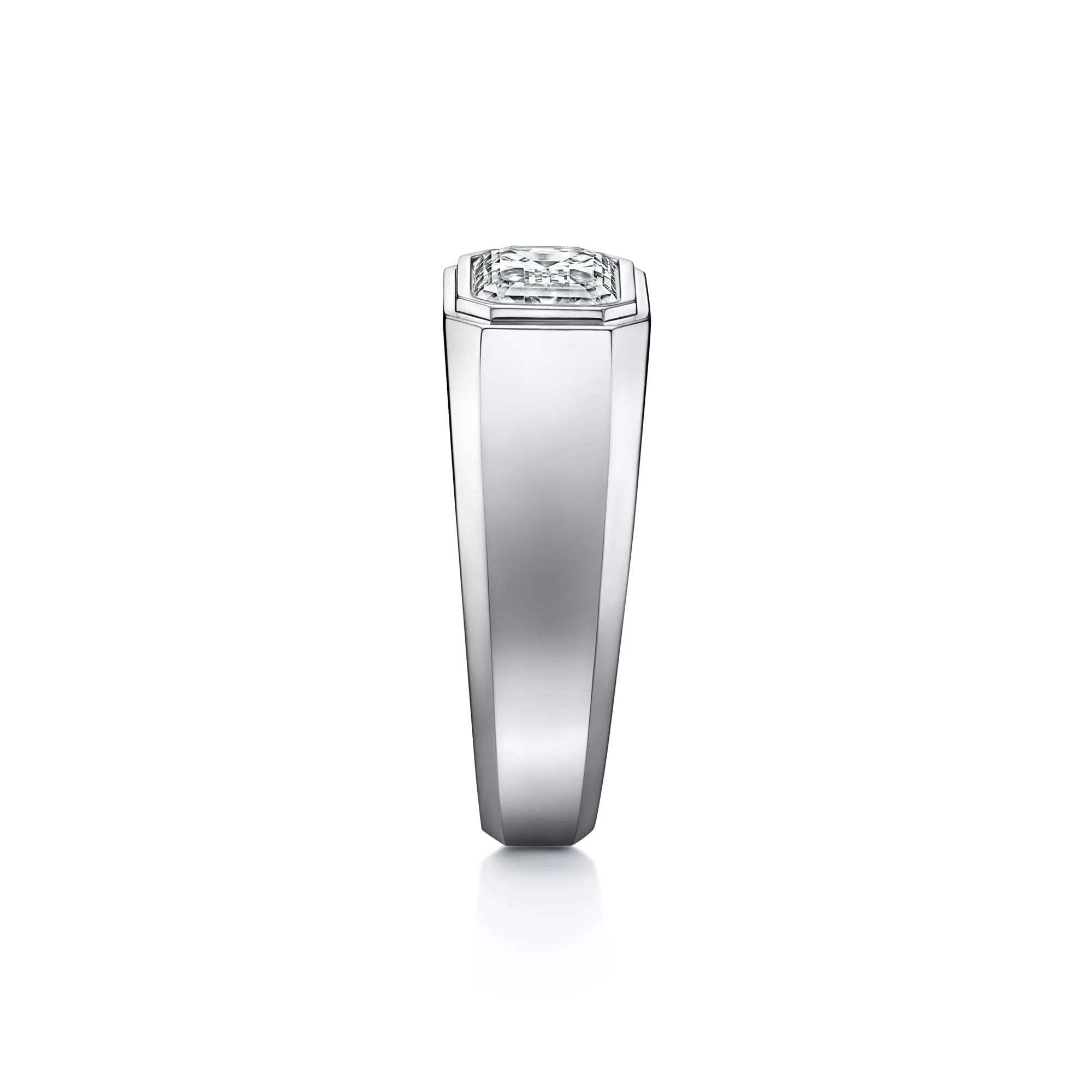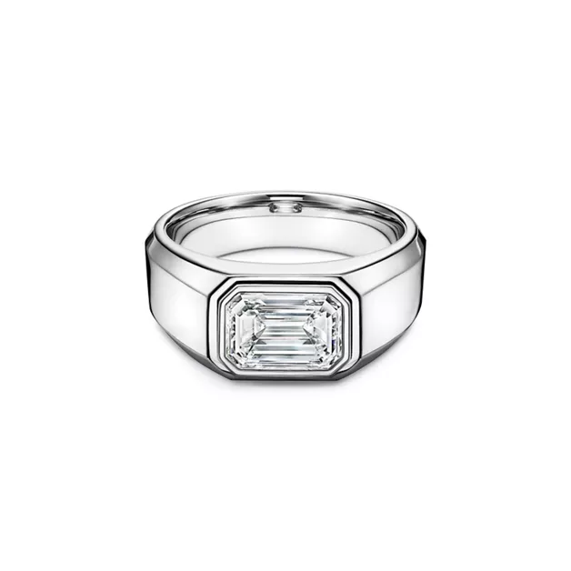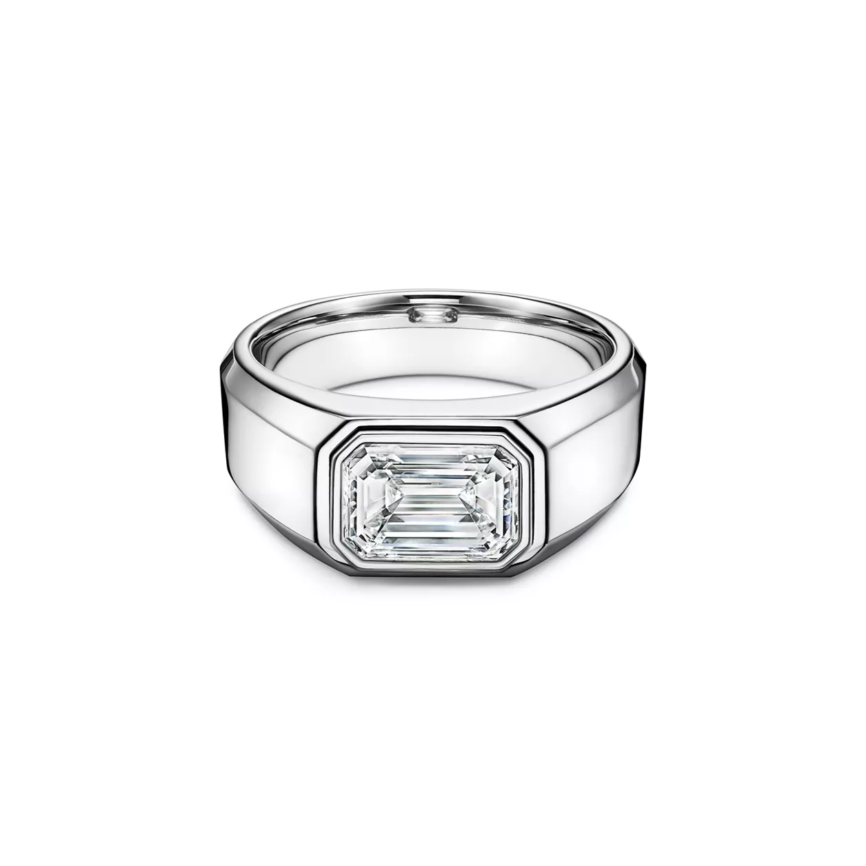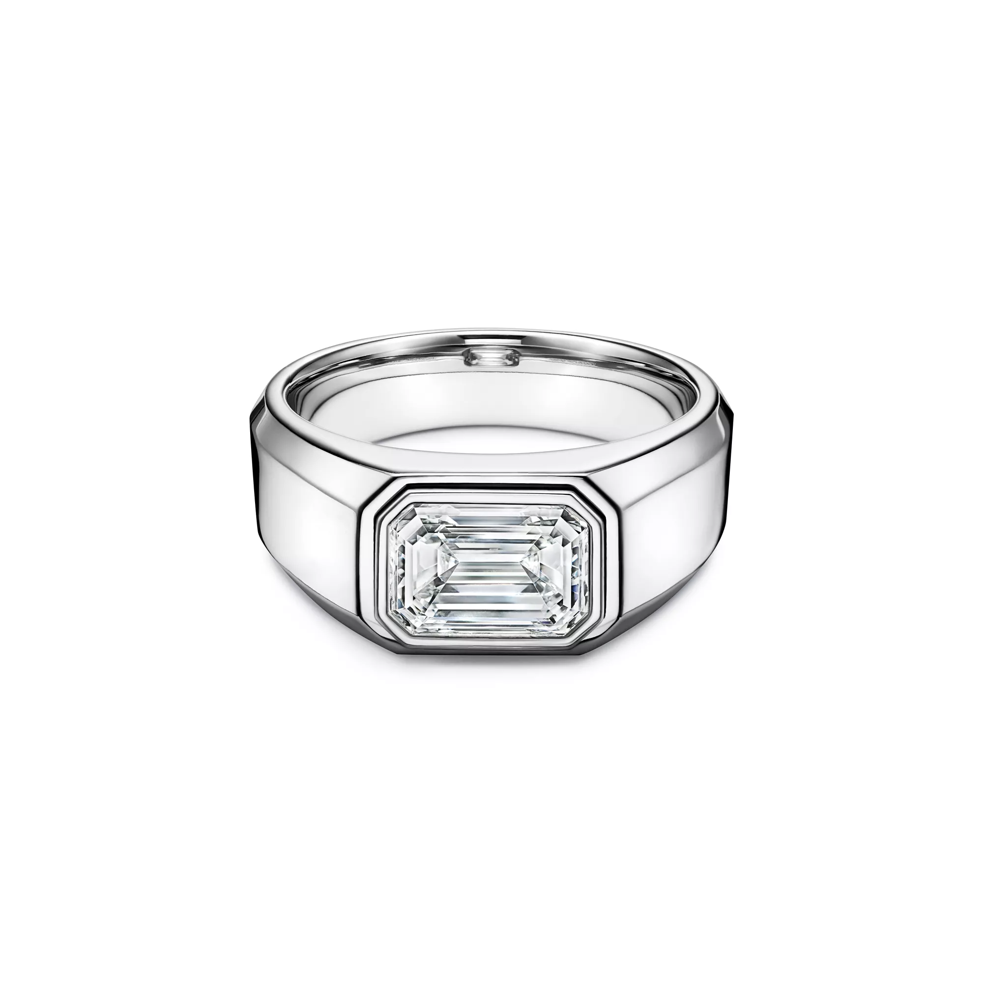 Signaling a bold new era of love, the Charles Tiffany Setting men’s engagement ring is a symbol of Tiffany's unrivaled craftsmanship. Expertly designed in platinum with a scintillating emerald-cut diamond in the center, this ring’s strong contours and clean lines rethink the traditional forms of the signet style.