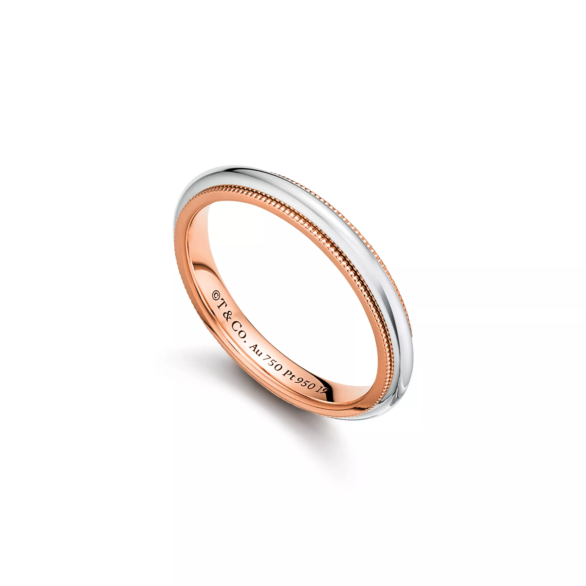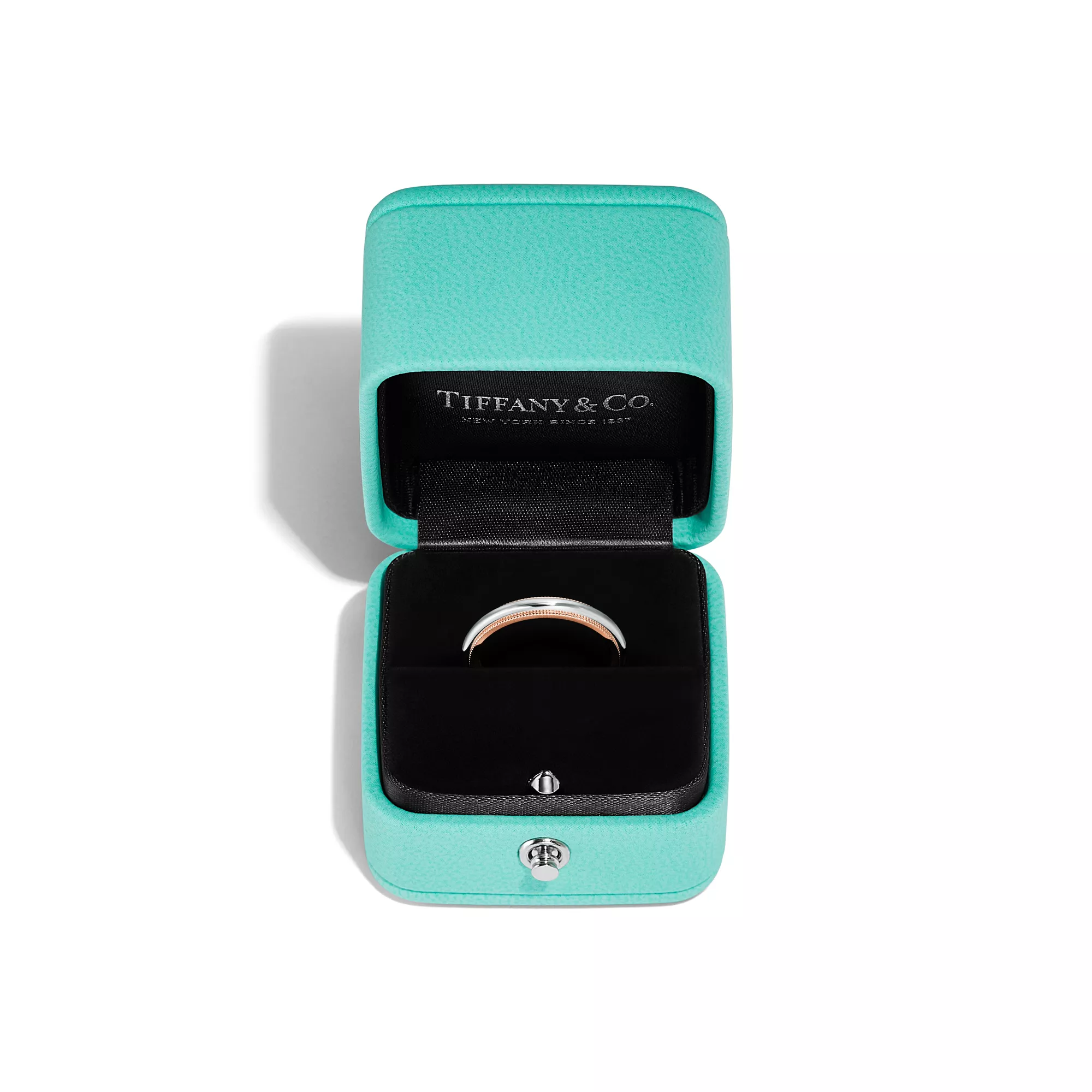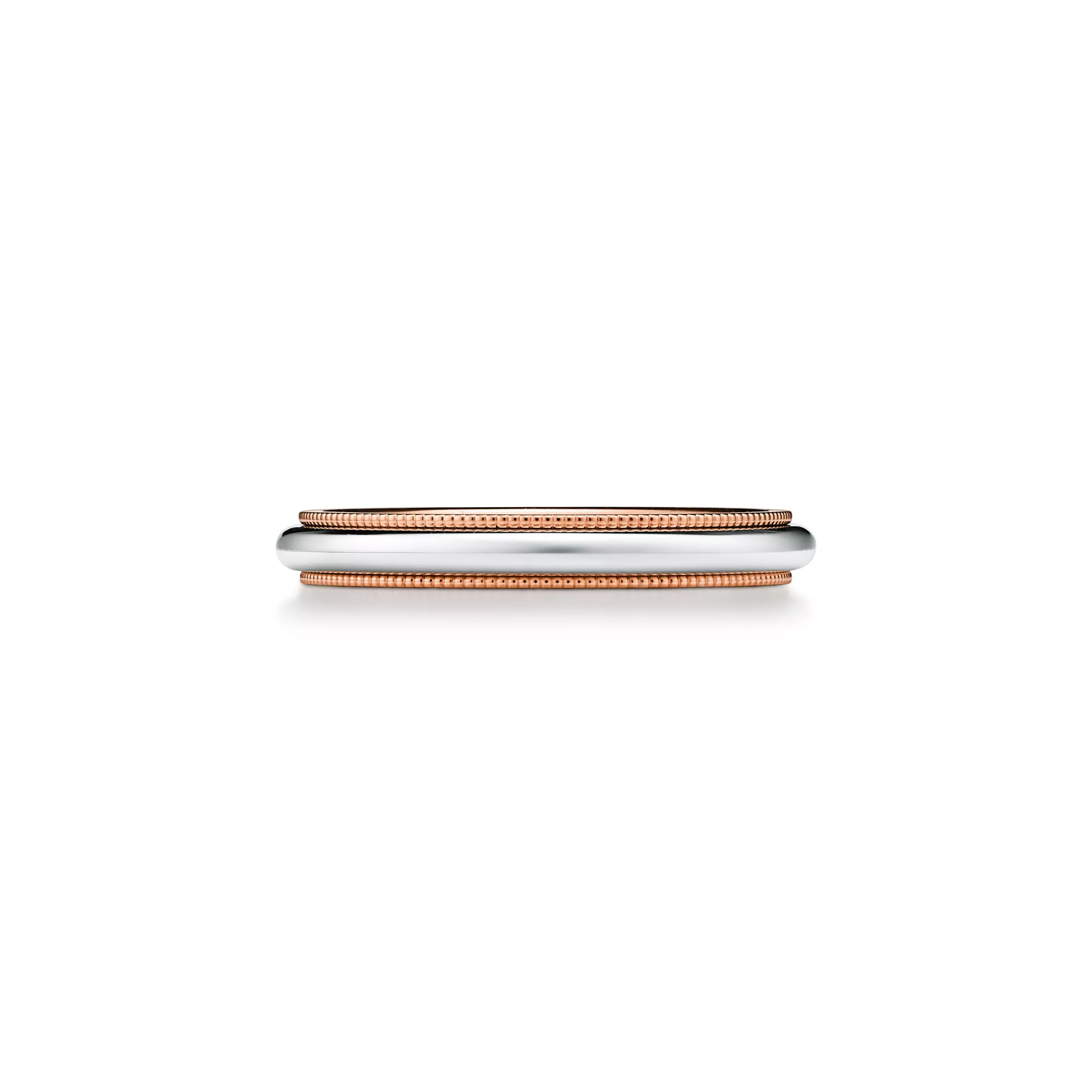 The Tiffany Together collection represents how our most important commitments are uniquely ours—and only we can define them. This sleek platinum band features textured milgrain detailing in 18k rose gold on both edges. Wear one ring as a wedding band or two stacked together for a bold look.