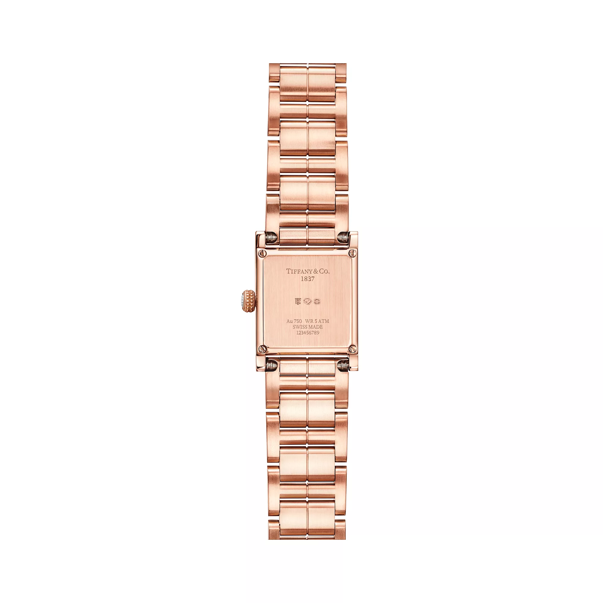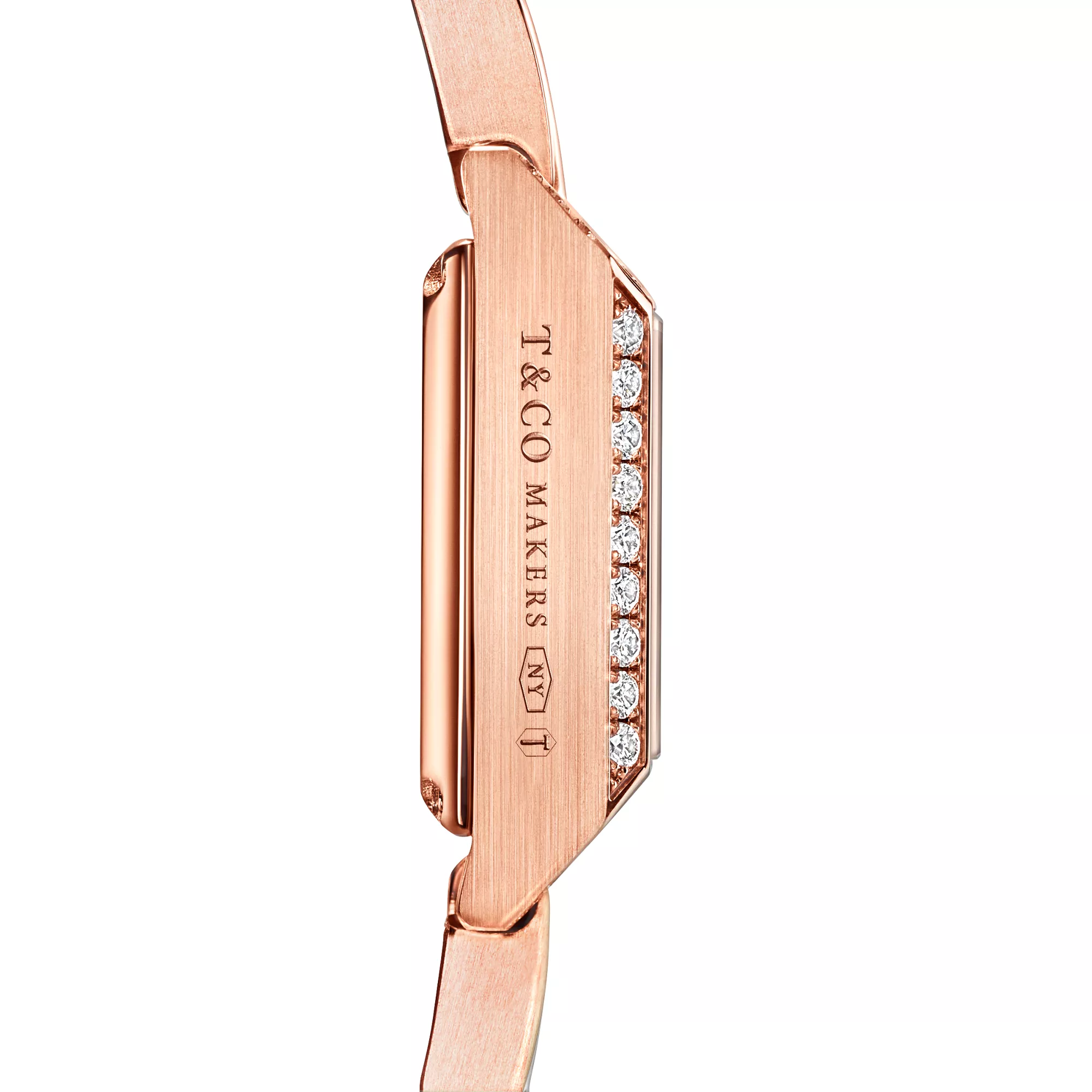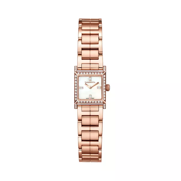 3. Tiffany 1837:Makers 16 mm Square Watch in Rose Gold with a White Mother-of-pearl Dial and Diamonds