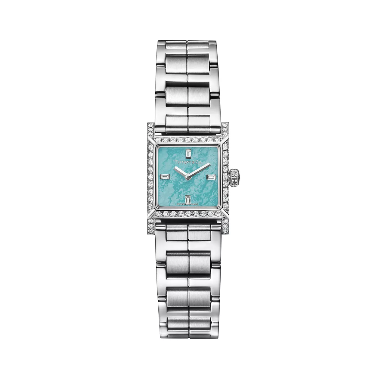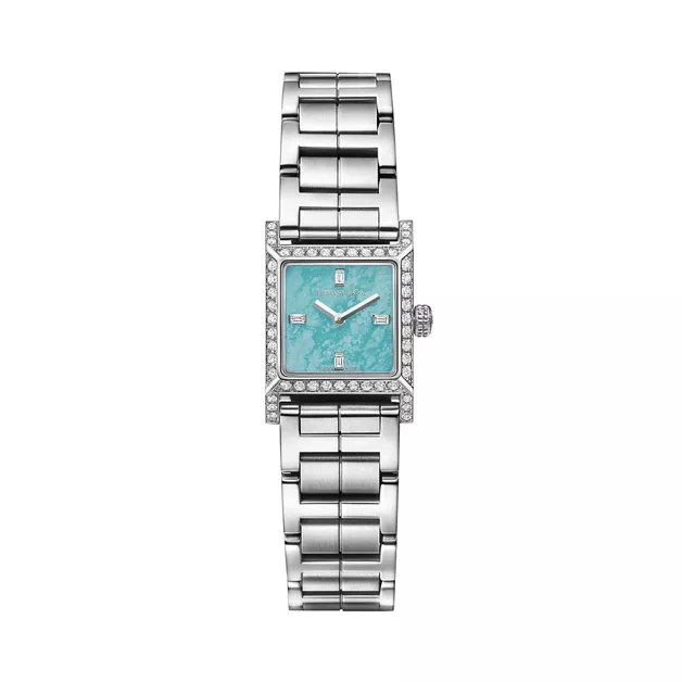 3. Tiffany 1837:Makers 16 mm Square Watch in Stainless Steel with a Turquoise Dial and Diamonds
